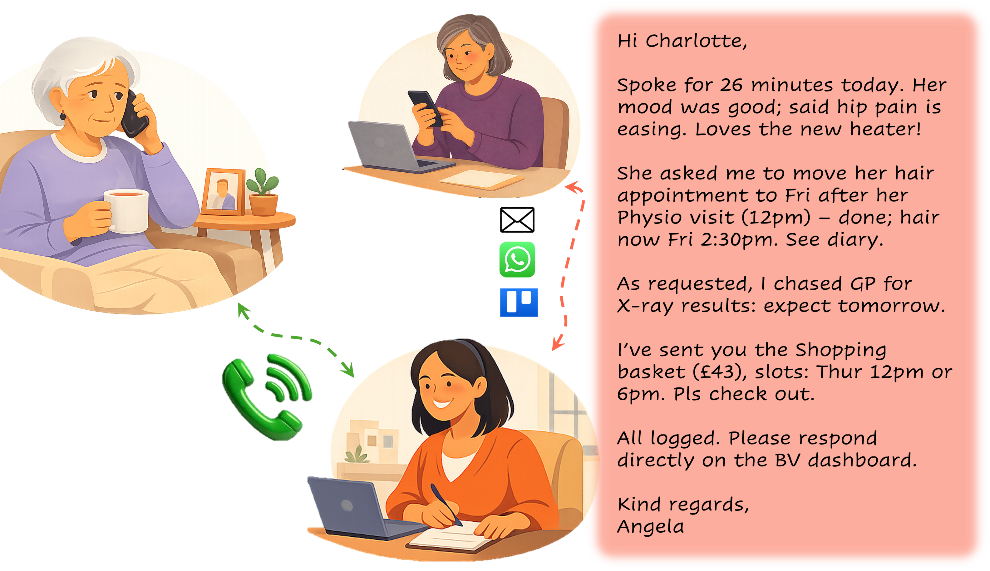 I’m Richard, founder of BetweenVisits. This service was inspired by my own experience when my late mother-in-law lived with us for three years. Despite excellent care workers, she remained lonely, anxious, and we were overwhelmed by day-to-day demands. Dealing with this alongside work and family life was a constant struggle.A few years later, working on a strategy project for Age UK, I was amazed to learn how widespread this problem is. In the UK, around 4 million1 adults are caring for ageing parents - and many are doing it in the margins of already full lives, leaving them overwhelmed much of the time.BetweenVisits can support you by providing scheduled daily telephone chats and help the family deal with practical tasks like booking appointments, chasing up, online shopping, and coordinating household or therapeutic services. You stay in control, with clear written updates and approvals.With 22 years building customer-data solutions in highly regulated sectors like financial services and telecoms, I’ve designed BetweenVisits with privacy and safety at its core. Our Companion Assistants are security-checked and Level 2 safeguarding trained, and are selected for their warmth, patience and experience in supporting older people, including those living with dementia.We aim to onboard families within days and can usually accommodate families with an urgent need such as a hospital discharge or upcoming travel. To learn more, book a short intro call today.
